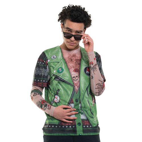 The Xmas Biker Demon Elves tee is bound to be the baddest holiday apparel to rock your party. All the style of a leather vest with tattoo sleeves wrapped up in a comfortable t-shirt for the Holidays. This super realistic t-shirt with a biker vest & tattoo arm sleeves is sure to get a lot of second looks as you're elfed up!