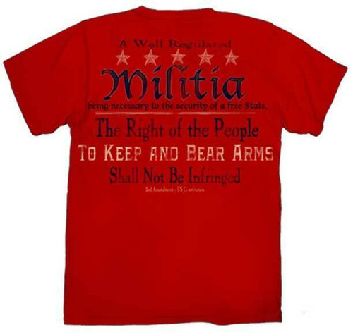 T-Shirt graphics on the back say " A well regulated militia being necessary to keep the security of a free state. The right of the people to keep and bear arms shall not be infringed"