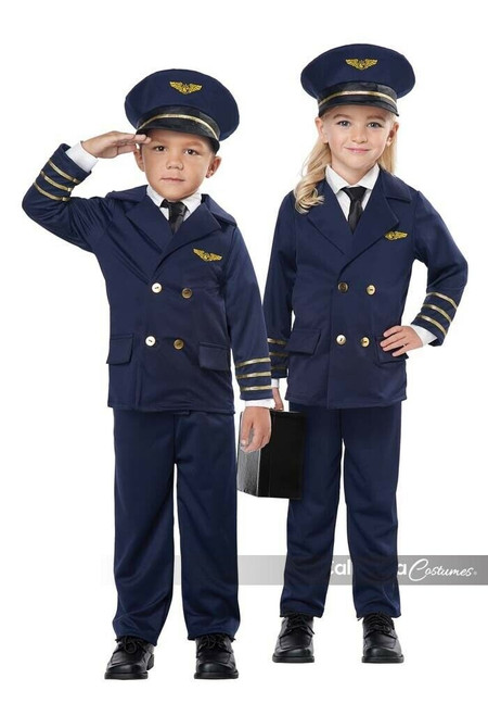 Product Description: We're flying the family friendly skies. The Pint-Sized Pilot toddler costume includes a button down coat with decorative pocket flaps and printed flight pin, a pair of pants and a hat.