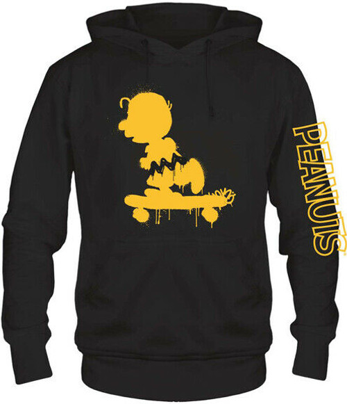 Officially licensed Peanuts Charlie Brown Character Styled Sweatshirt. Made from a cotton/polyester blend, this black "Peanuts" hooded sweatshirt features a "Charlie Brown" character design.