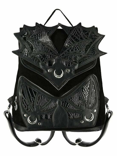 Gothic, small backpack (fits A4) made of artificial suede. The front is decorated with layered bat wings covered with dragon leather. The leather looks like dragon scales - it has a three-dimensional structure and reflects light.